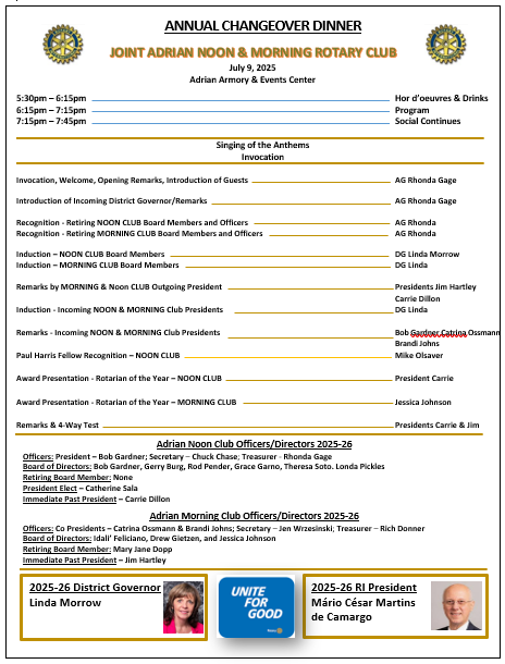 July 9th -Upcoming Changeover with AM Rotary will be on July 9th, Adrian Armory 230 W Maumee St Adrian. A “BIG THANK YOU” to Mark and Mary Murray for hosting the event. More details to follow as the date gets closer. DGE Linda Morrow will be attending!