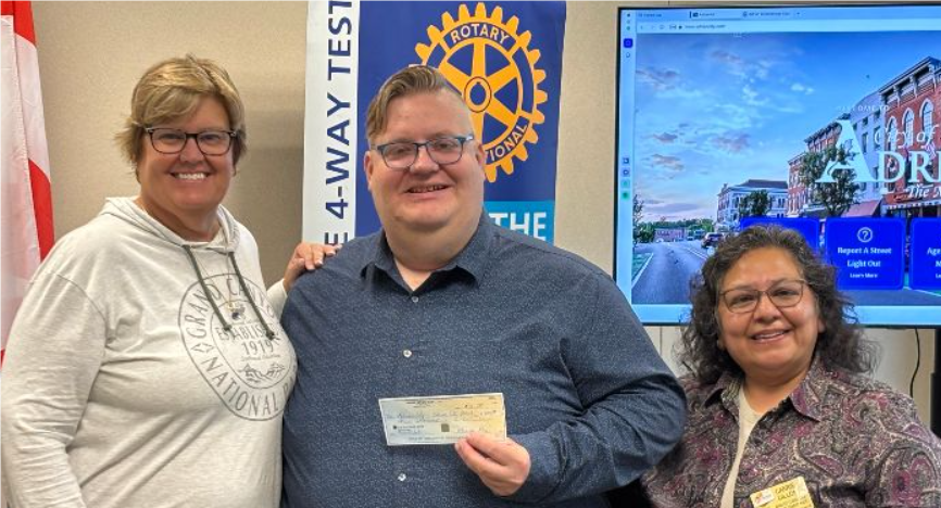 The Adrian Noon Rotary Club presented Adrian City Band Director Brian Gorski with a check in the amount of $3,000 as their match to the proceeds raised last summer during the concerts. Pictured here from L to R are: Club member Cindy Denning Moore, Brian Gorski and Club President Carrie Dillon.