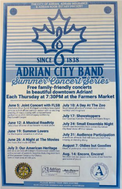 June 5th, 12th, 19th, 26th-Service Project-Adrian City Band-Toledo St Pavilion. Come and support the Adrian City Band.