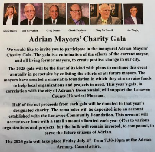 Mayor Angie also mentioned the Adrian Mayors' Charity Gala which is scheduled on Friday, July 4th at the Adrian Armory beginning at 7:30PM - 10PM. Sponsors are being sought.